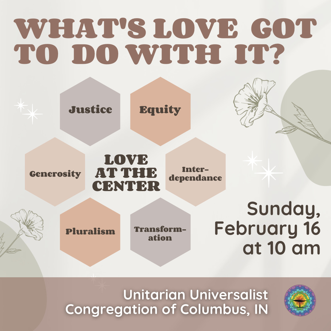 Service Blurb: While Unitarian Universalists talk a whole lot about love, what do we really mean by it? As we are called to put Love at the Center, we will explore the breadth, depth, and meaning of love as a spiritual tool for living in our world today.